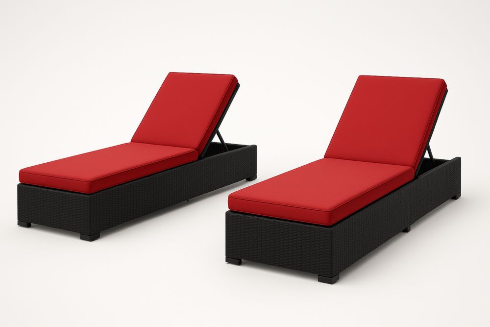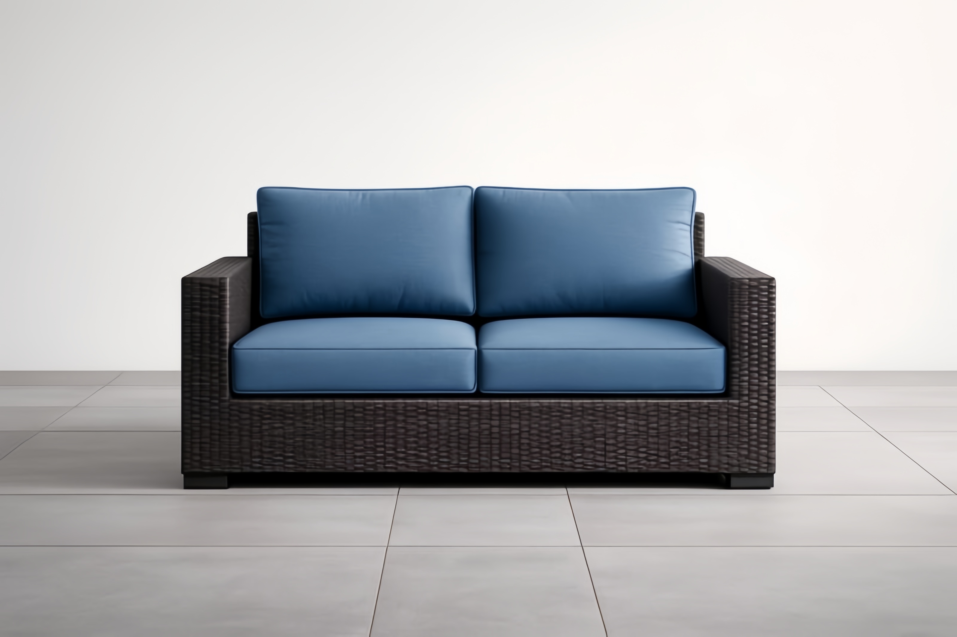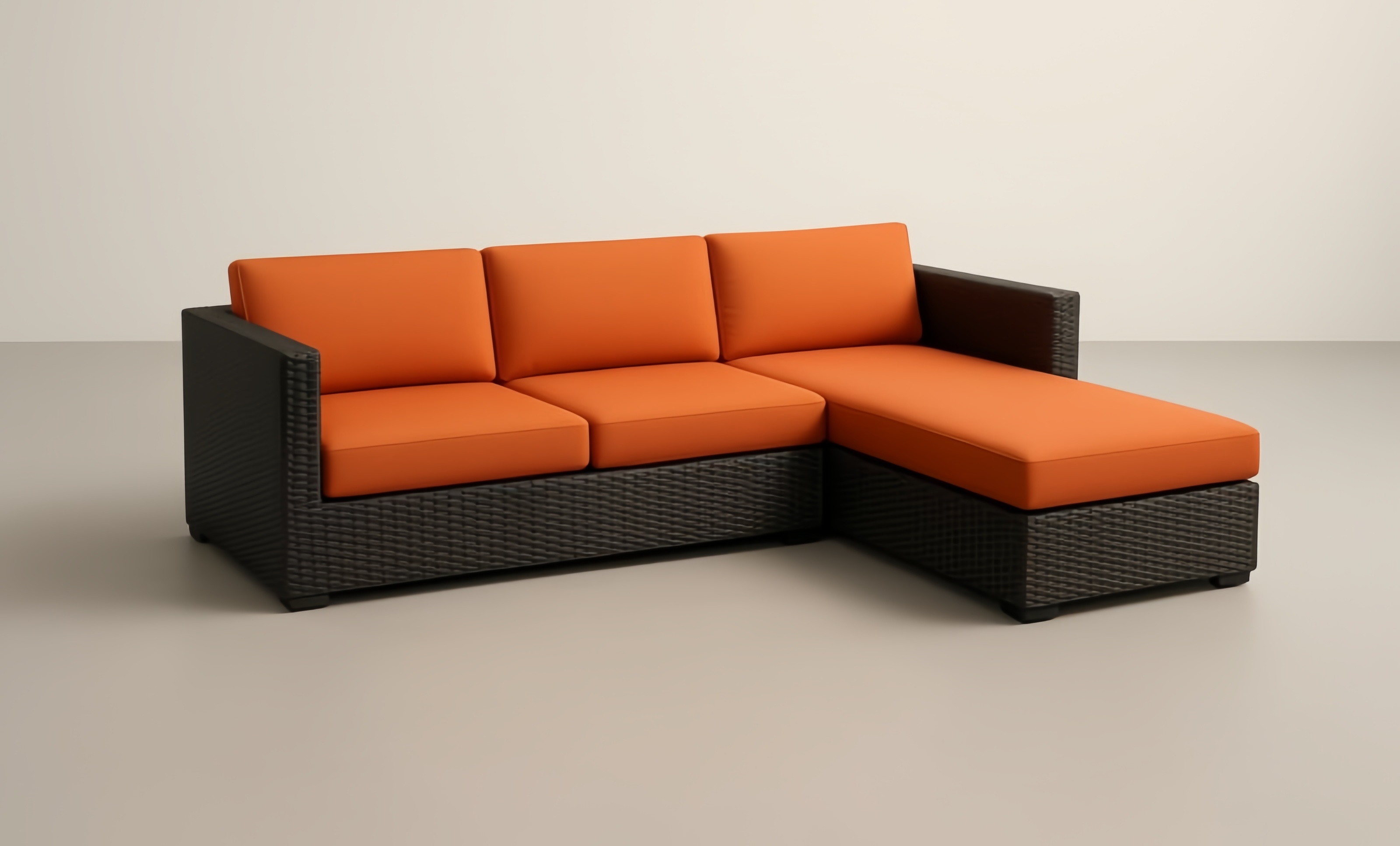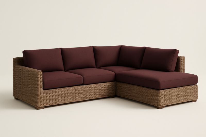 Canapé d’angle avec structure en résine tressée et coussins en polyester coloris bordeaux. Conception adaptée à un usage extérieur.
